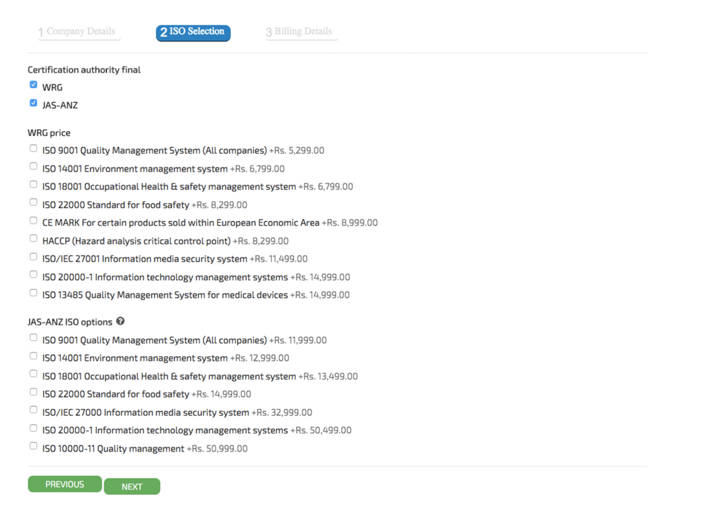 It’s up to your choice whether you choose any ISO registration or JAS-ANZ certification, you can also select multiple registrations or certifications at the same time. Once you are done with the selection, you will be directed to the Billing details page.